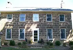 Constructed of sandstone on a foundation of another kind of stone,[3] the Harper House is typical of the once-common vernacular building form known as the I-house. The two-story interior is built around a central hallway on each floor, with rooms on either side.[2] The façade is a simple rectangle, with narrow sides rising to gables and a wider five-bay façade. A chimney pierces the roofline at either end, while the façade features openings in each bay of each story; all are windows except the center of the first story, in which the main entrance is placed.[3] The building is exceedingly simple, with virtually no ornamentation; the sole exception is slight decoration above the main entrance on the lintel. Assorted farm-related outbuildings surround the house, which predates all of the outbuildings.[2]
