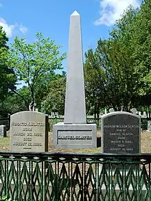 In 1791, Slater married Hannah Wilkinson; she invented two-ply thread, becoming, in 1793, the first American woman to be granted a patent.[10] Samuel and Hannah had ten children together, although four died during infancy. Hannah died in 1812 from complications of childbirth, leaving Samuel with six young children to raise.[11] Along with his brother, Samuel started the Slater family in America.