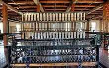 In 1789, leading Rhode Island industrialist Moses Brown moved to Pawtucket, Rhode Island to operate a mill in partnership with his son-in-law William Almy and cousin Smith-Brown.[1] Almy & Brown, as the company was to be called, was housed in a former fulling mill near the Pawtucket Falls of the Blackstone River. They planned to manufacture cloth for sale, with yarn to be spun on spinning wheels, jennies, and frames, using water power. In August, they acquired a 32-spindle frame "after the Arkwright pattern" but could not operate it. At this point, Slater wrote to them, offering his services. Slater realized that nothing could be done with the machinery as it stood and convinced Brown of his knowledge. He promised: "If I do not make a good yarn, as they do in England, I will have nothing for my services but will throw the whole of what I have attempted over the bridge."[4] In 1790, he signed a contract with Brown to replicate the British designs. Their deal provided Slater the funds to build the water frames and associated machinery, with a half share in their capital value and the profits derived from them. By December, the shop was operational with ten to twelve workers. By 1791, Slater had some machinery in operation, despite shortages of tools and skilled mechanics. In 1793, Slater and Brown opened their first factory in Pawtucket.