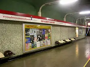 The station was opened on 15 September 1975 as part of the inaugural section of the line between San Pablo and La Moneda.[1] It was opened under the name of Pila del Ganso, due to a decorative fountain located just above the station in the central reservation of the Alameda, close to Toro Mazotte street. In 2005, because of the recent canonization of Alberto Hurtado, the board of directors of Metro S.A. approved the change of name of the station to San Alberto Hurtado, whose sanctuary and Hogar de Cristo headquarters are located close to the station.