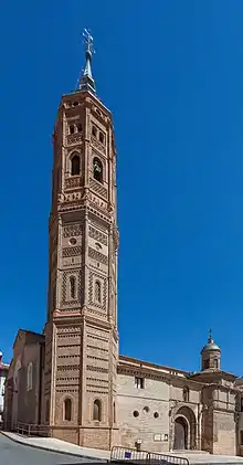Like the tower of the Santa Maria la Mayor in town, the architecture is Mudéjar. In reality, the tower is composed of two concentric towers with a stairwell inside the latter. The inner tower, hollow, houses a small octagonal chapel. It is almost certain that construction proceeded over decades if not centuries, and that the final bell-unit was not complete till the 16th century. The brickwork becomes more highly decorated in the higher stories.[1]