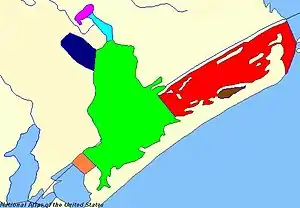 The Karankawa Indians used the land near the Guadalupe River delta and San Antonio Bay for camping purposes.[2] They also populated Matagorda Island on the opposite side of the bay. Captain Luis Cazorla of Presidio La Bahía crossed San Antonio Bay to visit the island in 1776, and discovered that the Indians had killed the mates of a shipwrecked British trading vessel.[3] For a short time, he convinced the Indian leaders not to kill shipwreck survivors on the island. An effort was made to convert the Indians with the establishment of Mission Refugio on San Antonio Bay in 1793, after Fray José Francisco Garza found a shallow crossing that the Indians used to travel to the mainland. To prevent the Indians from using Matagorda Island as a hiding place to stage attacks, La Bahía commandant Juan Cortés burned and cut brush around the point of crossing. No permanent colony was ever established on the island.[4]