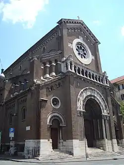 The façade, by Passarelli, is in the Neo-Gothic style of Lombardy. It is covered with red stone, with decorative elements in travertine. Before it is a large staircase. There are three doorways, each with a lunette with bas-relief above. Over the central one is Christ presenting Saint Camillus to the Sick, to the sides are Christ between Children and The Pardon of the Adulteress. Between the two stories is a gallery decorated with symbols of the Evangelists.