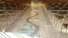 The floor emphasizes the connection path between the entrance and the altar. The design, created by Antonio Teruzzi, is a stylized tree. The leaves are made with mosaic technique,[10] the trunk instead is made with pieces of marble. The tree is a thick figure of symbolic meanings: it refers to life that transcends time and space. The tree has the truck on the surface of the earth, the roots in the ground and the branches in the sky. This symbolically takes up the salvation-historical time path from the Creation to the coming of Christ, with the intent of making the entrance-altar journey as a passage from darkness to light. Teruzzi was assisted by Luigi Beretta in the collection of biblical references. Along the tree-trunk are represented the stages of the history of salvation. Each stage or day of history is marked by a stone. At the base appears a continuous line, without interruption, in dark colors and dotted with tiny bright flashes (few golden mosaic tiles). It represents the primordial chaos which preceded the Creation, when the earth was a formless void and darkness covered the abyss (in black tiles), but already the spirit (in clear tiles) hovered over the waters (Gen. . 1:29). The creation is marked by stones 7, numbered from 1 to 7 with simple marble tiles, and they are one for each day. On each of them it is represent the work of God in that day as written in Genesis. After the Creation are remembered the 10 generations Cycle from Adam to Noah and 10 generations from Noah to Abraham. Each group is made with different shades of color of the marble tiles, on which there are marked at the most salient character names from which generations are named. So we read the names of Adam, Noah, Shem, Abraham, Isaac, Jacob, Judah and then David, Solomon and finally Mary and Joseph. The generations from Adam to Jesus are linked along the axis of the shaft by a continuous sinusoidal curve, similar to a spiral. The mosaic is in reddish hues. From Jacob the branches beginning to widen: 12 branches to mark his 12 children, that, after Jacob, all become owners, heirs of the promise of a land, as descents of a Messiah.[4]