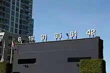 Prior to moving to Petco, the team played at Qualcomm Stadium, where the retired numbers were originally displayed on banners hanging from the light towers above the left field stands.[24][25] However, Garvey's number was commemorated instead on the wall behind the spot in right-center field where his winning home run in the 1984 NLCS cleared the fence, but the number disappeared when the stadium was expanded in 1997 and the location was masked by an overhang.[4][25][26] It reappeared in 2002 when all the retired numbers were moved and inscribed on the outfield fence.[25]