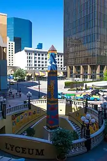 In the 1980s a dilapidated old theatre, the Lyceum on F Street in Downtown San Diego, was scheduled to be demolished to create the Horton Plaza shopping center. The Rep obtained permission to use the 400-seat theatre as a second performance site until it was torn down. The larger venue gave the company a higher profile and a doubled budget. Also, the company's ability to draw thousands of theatergoers to a downtown site increased the pressure on the developers to include a theater in the Horton Plaza project. So a theater space was identified, completely underground below an already-built drugstore, and developed into a performing arts complex with two venues: a 550-seat mainstage theater and a flexible performance space that can accommodate up to 250 seats.[3] The city owns the facility, which is overseen by the nonprofit Horton Plaza Theatre Foundation.[3]