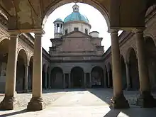 From the courtyard, the architecture seems dour except for the domes of the church. The interior of the church in Greek Cross layout, is decorated by Giovanni Manfredini with Grotteschi, an ornamentation then utilized in cemetery churches due to their prevalence in Roman catacombs.