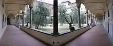 The cloister, dating to 1438–1440, features Ionic columns. It has several coat of arms from the 15th-19th centuries, and several frescoes: a lunette with the Madonna and Child and a tabernacle with the Madonna Enthroned and Saints from the early 14th century.
