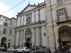 Construction of a church began in 1634 using designs of Pellegrino Pellegrini with the patronage of Christine Marie of France, Duchess of Savoy. It was built adjacent to a convent for monks of the Franciscan order. The church was frescoed both on the interior and exterior of the facade by Francesco Guatier of Saluzzo. The main altarpiece was painted by Tommaso Lorenzoni. In the Chapel of the Holy Trinity, there is a canvas by Sebastiano Taricco. The paintings of six apostles found in the choir, were painted by Bartolomeo Guidoboni. In the last century, the convent was converted into a school.[1]