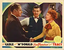 San Francisco is a 1936 musical-drama disaster film directed by W. S. Van Dyke, based on the April 18, 1906 San Francisco earthquake. The film stars Clark Gable, Jeanette MacDonald and Spencer Tracy. MacDonald's singing helped make this film a major hit, coming on the heels of her other 1936 blockbuster, Rose Marie.