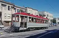| Various high-floor cable cars | Powell: 1-28, California: 49-60 (40 cars) | 1873– | Cable Car | ![]() |