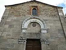 The church was located alongside an Ancient Roman road. In 1105, a church and hospital were founded to attend pilgrims in route south. The layout is that of a Latin cross with a single nave and hemi-circular apse. The original bell-tower was razed, and replaced at the same site by a new tower in 1894. The facade has sculptural decoration attributed to followers of Guidetto.[1]