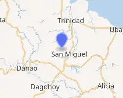San Miguel is located in the northern interior of the province. It is 86 kilometers (two to three hours bus ride) from Tagbilaran with a total land area of 12,329 hectares (30,466 acres) bounded in the north by the municipality of Trinidad, in the south by the municipality of Dagohoy, in the west municipality of Danao and in the east by the municipality of Ubay.