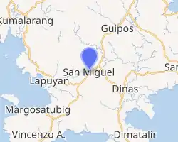 San Miguel, officially the Municipality of San Miguel (Cebuano: Lungsod sa San Miguel; Subanen: Benwa San Miguel; Chavacano: Municipalidad de San Miguel; Tagalog: Bayan ng San Miguel), is a 4th class municipality in the province of Zamboanga del Sur, Philippines. According to the 2020 census, it has a population of 19,838 people. [3]
