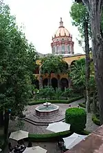 The Nuestra Señora de la Salud Church was built by Luis Felipe Neri in the 18th century. The main portal is in Churrigueresque (Spanish Baroque) style with two levels and a crest in the shape of a large seashell.[4][14] The first level has an arch flanked by pilasters and niches with sculptures of the Sacred Heart and John the Evangelist. The interior has a layout of a Latin cross covered with vaults with side walls covered in oil paintings done by Agapito Ping between 1721 and 1785.[4] One altar contains an image of Christ, the Good Shepherd, defending his sheep from various dangers including a group of unicorns.[33] The church served as the chapel of the Colegio de San Francisco de Sales next door.[34] The Colegio de San Francisco de Sales was as important as the college of San Ildefonso in Mexico City in the 18th century.[14] Both Ignacio Aldama and Ignacio Allende attended school here.[34]