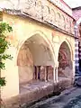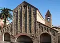 The entrance is found on the left side of the church. The white and black coloring of the portal (from 13th century) matches the gothic protruding porch, made of stone and bricks, supported by two columns. To the left of the entrance located are two monumental arcosolium tombs (13th–14th century). Still can be seen some traces of frescos attributed to celebrated Lombardian artists. On the right of the protruding porch situated is the tomb of Gandolfo De Gasco (1272), as can be read from the Gothic inscription. Between the church and the surrounding wall can be seen four Paleochristian sarcophagi (5th–7th centuries), discovered during the archaeological excavations. It is worth noting that the central apse is decorated with eleven Islamic bowls, above the row of small blind arches. These decorative elements (recently taken for restoration, the present ones are copies) are among the most ancient walled bowls in Liguria (from about 1050 AD). Important archaeological excavations were carried in the 70's by Nino Lamboglia in the area around the church. Found were remains of a Paleochristan baptistery and late antique necropolis. Later excavations under the Ligurian Archaeological Superintendence showed also remains of a settlement of craftsmen and of the early church edifice (6th century).