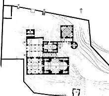 To the south-east of the main monument, at a distance of about 70 - 100 m, [9] there are two small, half-ruined structures: St. Hakob Church and St. Harutyun Chapel. The church is a domed hall built in the second half of the 10th century, with a rectangular exterior and a cruciform interior. Destroyed in 1753, some of the stones were used in 1815 to renovate the Church of the Holy Savior. The chapel (second half of the 13th century) is a simple, rectangular vaulted hall with two equal eastern tabernacles and a richly designed western entrance.