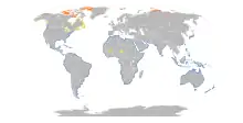 The sanderling breeds in the High Arctic areas of North America, Europe and Asia. In North America, it breeds in the Canadian Arctic Archipelago, Nunavut, Greenland (and to a lesser extent Alaska). In Eurasia, it breeds in Spitsbergen and areas of northern Russia from the Taymyr Peninsula to the New Siberian Islands. In the northern winter, it has a nearly cosmopolitan distribution across the world's marine coasts. It is a complete migrant, travelling between 3,000 to 10,000 km (1,900 to 6,200 mi) from its breeding grounds to its wintering sites. Birds that travel further also arrive later and leave sooner. Most adults leave the breeding grounds in July and early August, whereas juvenile birds leave in late August and early September. The northward migration begins in March at the southern end of their winter distribution.[9]