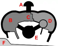At the centre of the new castle was a circular keep, with three ovoid towers and bastions around it on the northwest, northeast and south sides, and a gatehouse to the north.[17] These were surrounded by two curtain walls, forming a triangular inner and outer ward.[18] Covered stone passageways, three storeys high, linked the towers, the keep and the gatehouse.[19] The outer ward was grassed over, with a stone cesspool by the side of the north-east tower, linked by sewers to the inside of the castle.[20] The castle was entered through a doorway in the rear of the gatehouse, originally called the "Half Moon", linked by a stairway in the covered passageway to the keep.[21] There were four tiers of guns in the finished castle, from the ground level up to the roof of the keep, and a total of 142 firing points for cannon and handguns; their design closely resembling those at nearby Walmer and Deal castles.[22]