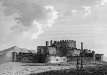 The modified castle was completed by 1808, and held eight 24-pounder (11 kg) guns along the outer wall, a gun on the roof of the southern bastion, and another on top of the keep itself.[52] The new castle could hold a garrison of 40 men.[52]
