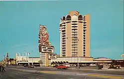The 200 guest rooms of the original hotel were divided into four two-story motel wings, each with fifty rooms, and named after famous race tracks.[60] They were set out in a hacienda style, and surrounded by a half-moon shaped pool.[4] The suites were luxuriously designed. Plush blue carpets and ivory colored chairs with white ceilings were the norm in the early days. An electric tram service, often attended by pretty showgirls, took the guests to their rooms.[61] A 14-story tower commenced construction in late 1965,[4] and was opened in 1967. It existed until November 1996 when it was demolished.[62]