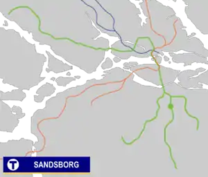 Sandsborg metro station is a station on the green line of the Stockholm metro, located in Gamla Enskede, Söderort. The station was inaugurated on 1 October 1950 as part of the inaugural stretch of Stockholm metro between Slussen and Hökarängen.[2] The distance to Slussen is 4.4 km (2.7 mi).