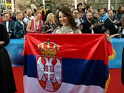 Sanja Vučić with the Serbian flag at the opening ceremony of the Eurovision Song Contest 2016