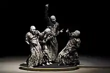 Sankai Juku's dancers have, like other typical Butoh dancers, shaved heads and bodies covered in white powder.[2] They may be costumed, partially costumed, or almost unclothed. Rarely wearing typical “street” clothing onstage, they sometimes wear long skirt-like garments.