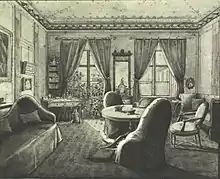 At the time of the 1834 census, No. 112 was home to four households. Carl Adolph Rothe, a counter admiral, resided on the ground floor with his wife Benedichte, their seven children (aged 10 to 23), two male servants and two maids.[3] Haagen Mathiesen, a Norwegian businessman and ship-owner, resided on the first floor with his "housekeeper" and de facto spouse Anne Bue (1783–1853) and two of their four children. One of the children, Louise, aged 19, would some 30 years later marry a future owner of the property. Another daughter, Julie, lived there with her husband Isaac Pierre Larpent (a medical doctor) and their two children (aged one and two).[4] Adolph Callisen, a military surgeon and professor of medicine, resided on the second floor with his wife Julie Callisen (née From), their six children (aged 11 to 19), a governess, a male servant and two maids.[5] Jørgen Rasmusen, a ship furnishings retailer, resided in the basement with his wife Magrethe Rasmusen and their two children (aged 14 and 21).[6] Peter Jürgen Pohlmann, a 39-year-old shoemaker, resided in the building with his wife Ana Maria Pohlmann, a 24-year-old foster son, a nine-year-old nephew and a six-year-old niece.[7]