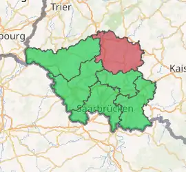 The district was created in 1834 when Prussia bought the Lichtenberg area from Saxony-Coburg.[2] After the World War I, the Saar area came under special rulership of the League of Nations, and thus the Sankt Wendel district was split into two parts. The northern part, the Restkreis Sankt Wendel, was merged into the district Birkenfeld, the southern part stayed in the Saarland in its reduced size.