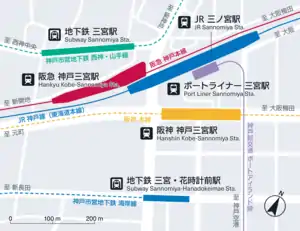 All of the lines below, and their representative stations, are adjacent to JR Sannomiya Station, or are in adjoining buildings, or can be accessed by the underground shopping center, Santica (さんちか).