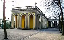 The palace has a single-storey principal block with two flanking side wings. The building occupies almost the entire upper terrace. The potential monotony of the façade is broken by a central bow, its dome rising above the hipped roof, with the name of the palace—remarkably, written with a comma and a full stop, viz. Sans, Souci.—[8][9] on it in gilded bronze letters. The secondary side wings on the garden front are screened by two symmetrical rows of trees each terminating in free-standing trellised gazebos, richly decorated with gilded ornaments.