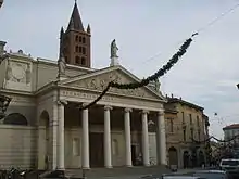 The interior of the church was again rebuilt in 1496 under the designs of Bernardino de Lera; while the present Neoclassical-style facade with simple portico of white columns was built in 1835 under designs of Luigi Voghera. Nearly all the 15th-century fresco decoration was lost. The nave was frescoed with an Allegory of Virtue in 1872. Fragments of the earlier decoration are conserved: A Grieving Madonna in the right nave, a Christ at the Column in the left nave. The left nave contains the Trecchi Mausoleum (1502) by Gian Cristoforo Romano. The third altarpiece on the left, depicts Saint Agatha. In the chapel of Saint Agatha is a Pietà , by Bernardino Gatti. The walls of the presbytery were frescoed with scenes from the Life of Saint Agatha (1537) by Giulio Campi. In a chapel of the left nave, is an altarpiece depicting the Holy Family with Mary Magdalen (1518) by Boccaccio Boccaccino.[1]