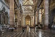 The interior, on the Latin cross plan, is divided into a nave and two aisles, with crossed vaults, separated by six columns each; the latter are in white or red Verona marble, with Gothic capitals. The four columns over the high altar show the coat of arms of the Castelbarco of Trento, a family who extensively contributed to the church's construction. Notable is the funerary monument to Cortesia Serego, on the left of the apse, which was finished in 1432 by Vincenzo di Stefano da Verona. It portrays the riding figure of Cortesia, clad with an armor and holding a commanding wand. His horse stands upon the sculpted sarcophagus, which has always been empty. The fresco part represents the Annunciation and the Saints Peter of Verona and Dominic.