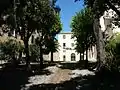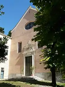 At the time of the foundation, the area was identified by the phytonym Bachernia, a reference to the berries of Rosa Canina (Italian: bacca), which is still used today to name the steep pathway (Italian: salita; Ligurian: crêuza) connecting the church to the New Walls.[2] In the 18th century, alongside rural buildings, the first suburban villas were built, including the first nucleus of Villa Madre Cabrini, which is located near the entrance of the church. The area developed into a village with a growing number of inhabitants.[3] The urbanization at the end of the 19th century saw the laying of the so-called Mountain Ringway (Italian: Circonvallazione a Monte) and the high-class Art Nouveau buildings of Corso Magenta and the Sant'Anna funicular being built immediately south of the church, but without affecting the integrity of the ancient hamlet.[4] To this day, Sant'Anna remains an oasis of calm within the city, with its sycamore trees, cobbled paving and beautiful vistas over the old city and the harbor, only few minutes away from the central Corvetto square.[5]