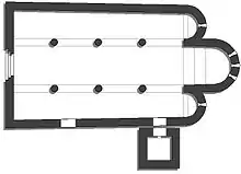 Sant Climent de Taüll is the largest, most well preserved, and has the most outstanding architecture out of all the churches in the Valley of Boí. The church is a basilica plan structure, that has three naves (each of them with a terminal apse), and large columns separating the side naves. One of the doorways opens on the west side of the building, with the remains of what might have been a porch.[4] The other openings are located on the south side and on the access tower. The facades of the church do not have any decoration, but the apses have simple Lombard decorations and are built with stone and brick. The central apse on the exterior is decorated by groups of four arches, separated by half columns. The apsidioles (apses on either side of the central apse), have groups of three arches instead of four, with each of the apses having one window each.[5] In addition, the central apse has three arched windows located on ground level and two portholes on either side of the central apse.