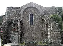 The monastery church was constructed as a T-shaped basilica with its nave and adjoining aisles separated by pillars. All that remains of the original building is the western end which unusually has an apse. The only example of its kind in Catalonia, it is in line with the Carolingian tradition. The main apse opens into three smaller apses, symbolizing the Trinity. The remains of the transept can still be seen but there are only a few small vestiges of the nave and the aisles. The nave was covered with barrel vaulting while the lateral aisles had quarter-circular vaults. There are still traces of the base of the primitive steeple but nothing is left of the cloister which was akin to that in the Cathedral of Santa Maria d'Urgell.[2]