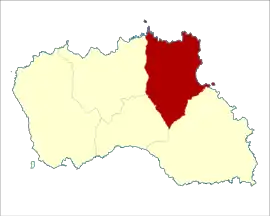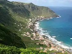 Apart from the socio-administrative centre of Santa Bárbara, the civil parish is identifiable by the Bay of São Lourenço, and locality of São Lourenço along the eastern coast.[8] This landscape was formed from a partially destroyed caldera, resulting in its concave form oriented towards the sea, with terraces constructed along its exterior walls to support agriculture.[8] The coastal area was built by successive generations, originally establishing residences at the water's edge, but successively branching into the interior. The concave coastal area includes several tourist-oriented villas, wine cellars and summer cottages used by locals throughout the year, in addition to the native community.[8]
