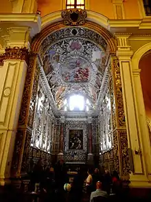 Among the altarpieces in the church is a depiction of the Blessed Geremia (1785) by Antonio Manno in the left transept, and a depiction of Santa Agnes of Montepulciano (1603) by Filippo Paladini. The first chapel on the right transept, dedicated to the Madonna del Rosario, survived the bombardment. It is richly decorated with polychrome marble and small tableux made with stucco (1697-1721) by Gioacchino Vitagliano. These teatrini or dramatic set-pieces depict the scenes of the Mystery of the Rosary. The ceiling is frescoes framed with elaborate stucco with the five glorious mysteries of the Rosary, by Pietro Aquila.[1] These tableux can be compared to the ones made by Serpotta for the adjacent oratory.