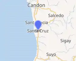 Santa Cruz (/ˈsæntə ˈkruːz/, officially the Municipality of Santa Cruz (Ilocano: Ili ti Santa Cruz; Filipino: Bayan ng Santa Cruz), is a 1st class municipality in the province of Ilocos Sur, Philippines. According to the 2020 census, it has a population of 41,366 people. [3]