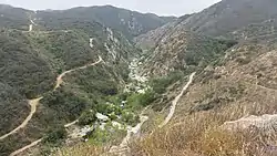 The mainstem of the Santa Margarita River begins at the confluence of Temecula Creek[11] and Murrieta Creek,[12] in southwestern Riverside County, east of Interstate 15, 0.5 miles (0.80 km) southeast of Temecula.[11] The river is formed when the two creeks merge.[5] It flows southwest through the 5 miles (8.0 km) Temecula Canyon at the south end of the Santa Ana Mountains. Along its lower 10 miles (16 km) the river forms a large floodplain as it crosses Camp Pendleton Marine Corps Base. It enters the Gulf of Santa Catalina on the Pacific approximately 3 miles (4.8 km) northwest of Oceanside.