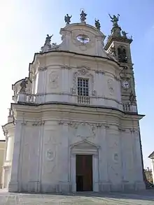 The church was designed by Filippo Juvarra and with a convex marble facade by Anton Maria Pirovano. The skyline of the facade and bell-tower is populated by an ebullient crowd of statues.[1]