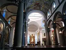 Among the altarpieces are six works by Giuseppe Velasques: a Martyrdom of St James, an Annunciation, an Assumption of the Virgin, Coronation of Mary, and Martyrdom of St Andrew. His Holy Family remained incomplete. The lunette frescoed with the Virgin saving the city of Randazzo from the Lava flow was painted by Alibrandi. Other paintings include an Assumption of the Virgin was painted by Giovanni Caniglia; a Martyrdom of St Agatha and St Lawrence by Onofrio Gabrielli; and a Martyrdom of St Sebastian by Daniele Monteleone; and a Baptism of Jesus by Francesco Paolo Finocchiaro.[3]
