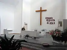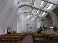 The church is structured by six asymmetric prefabricated concrete frames, or arches in descending size towards the chancel. They support a series of prefabricated light scoops, which are conic sections, giving the church its distinctive exterior profile, which some liken to an abstraction of the local Apennine mountains.[3] The facades are faced with mortared stone, and the roof is copper sheeting. The interior is mostly whitewashed plaster, which advantageously reflects northern light brought in from the scoops above. Wooden pews, each slightly shorter in length than the preceding one as they approach the chancel are placed on the terra cotta tile floors. The altar is unadorned and hewn from a single block of marble. The tabernacle was also designed by Aalto, although it is not in its original location.[3] A slightly sunken hexagonal baptistery is appended to the northwest corner of the church, that has a large pyramidal skylight placed over the baptismal font as well as a vertical slit window viewing the river Reno, which flows by the church to the north.