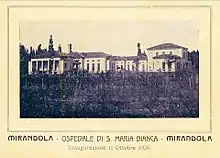 First records of a "hospitale" in Mirandola dates back to 1311, in a document which also mentions two branches in Tiramuschio (today Tramuschio) and Borgo Bonaga (later called Borgofuro or Borgonovo).[1] Another hospital run by the Hospital Brothers of Saint Anthony was located in Roncole.[2] In 1385, the Mirandola hospitals received a considerable sum of money from certain inheritances; moreover, the ancient Statutes of the land of the municipality of Mirandola and the court of Quarantola of 1386 guaranteed exemption from duty to donors of flour or wheat, as well as movable and immovable property.