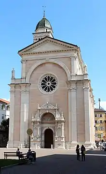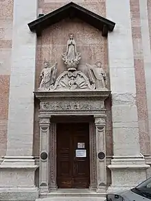 The Renaissance church begun in 1520 is built in red and white stone. The main façade consists of an arched entrance in renaissance style with a door commissioned by Prince-Archbishop Cristoforo Madruzzo in 1539.[6] Above the door is a lunette depicting the Annunciation. The bell tower, 53 metres high, is the tallest in the city. Constructed of white limestone, it has two rows of three-mullioned Romanesque windows and a polygonal cupola. Beside the church stands a column erected in 1845 memorialising the celebrations for the third centenary of the opening of the Council of Trent.