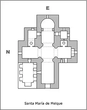 There was originally a Roman settlement at the location, with five dams across the two brooks that surround a small, rocky hill. Santa María de Melque came into being as a monastic collection inside the Catholic Kingdom of Toledo. Construction commenced in the 7th century, coinciding with the end of the Visigothic kingdom. It has been argued that construction came to a halt with the arrival of the Arabs, to be continued later, although there is a counter-argument that the architecture shows Syrian influence (specifically Syro-Umayyad).[2] It appears that there was an Islamic settlement at Melche in the 8th century.[1]