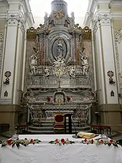 The interior has a Greek cross plan. The cupola is decorated by stuccoes by Giuseppe Cristiano. The main altar and the majolica pavement wes designed by Vaccaro. It is flanked by the heraldic symbols of the Mercurio family. The 16th century statue depicts the Immaculate Conception. The chapels have paintings by Vaccaro, Tommaso Martini, and Nicola Maria Rossi. The Vaccaro brothers also completed the majolica pavement.