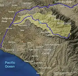 Santiago Creek is a major watercourse in Orange County in the U.S. state of California. About 34 miles (55 km) long, it drains most of the northern Santa Ana Mountains and is a tributary to the Santa Ana River. It is one of the longest watercourses entirely within the county.[2] The creek shares its name with Santiago Peak, at 5,687 ft (1,733 m) the highest point in Orange County, on whose slopes its headwaters rise.