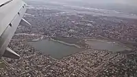 The creek then empties into Irvine Lake, which is also fed by Limestone Canyon, a left-bank tributary. The 700-acre (280 ha) reservoir is formed by the 110-foot (34 m) Santiago Dam, located at its north end.[4][5] Irvine Lake provides water to Villa Park and Orange via a pipeline and flume to Peters Canyon Reservoir. Because the flume diverts the creek's entire flow, the creek below the dam is dry except during floods.[6] Below the dam the dry riverbed meets Fremont Canyon, a right bank tributary, and crosses underneath California State Route 241. It then flows northwest, bisecting Irvine Regional Park, and receives Weir Canyon Creek from the right. Near Villa Park, the Villa Park Dam forms a flood control reservoir to control spills from Irvine Lake. Below Villa Park, the creek is confined to a flood control channel for the remaining 7 miles (11 km) of its course.[4][5] Flowing roughly southwest between the cities of Orange and Santa Ana, it receives Handy Creek from the left, then crosses under California State Route 55 and 22, through Hart Memorial Park and Santiago Creek Park. Because the creek is dry most of the year, portions of the river bed are used as parking lots when conditions permit. The creek then crosses under Interstate 5 and continues west toward the Santa Ana River. Its confluence is on the river's left bank, inside the Riverview Golf Course. About 10 miles (16 km) below the confluence with Santiago Creek, the Santa Ana River enters the Pacific Ocean at Huntington Beach.[4][5]